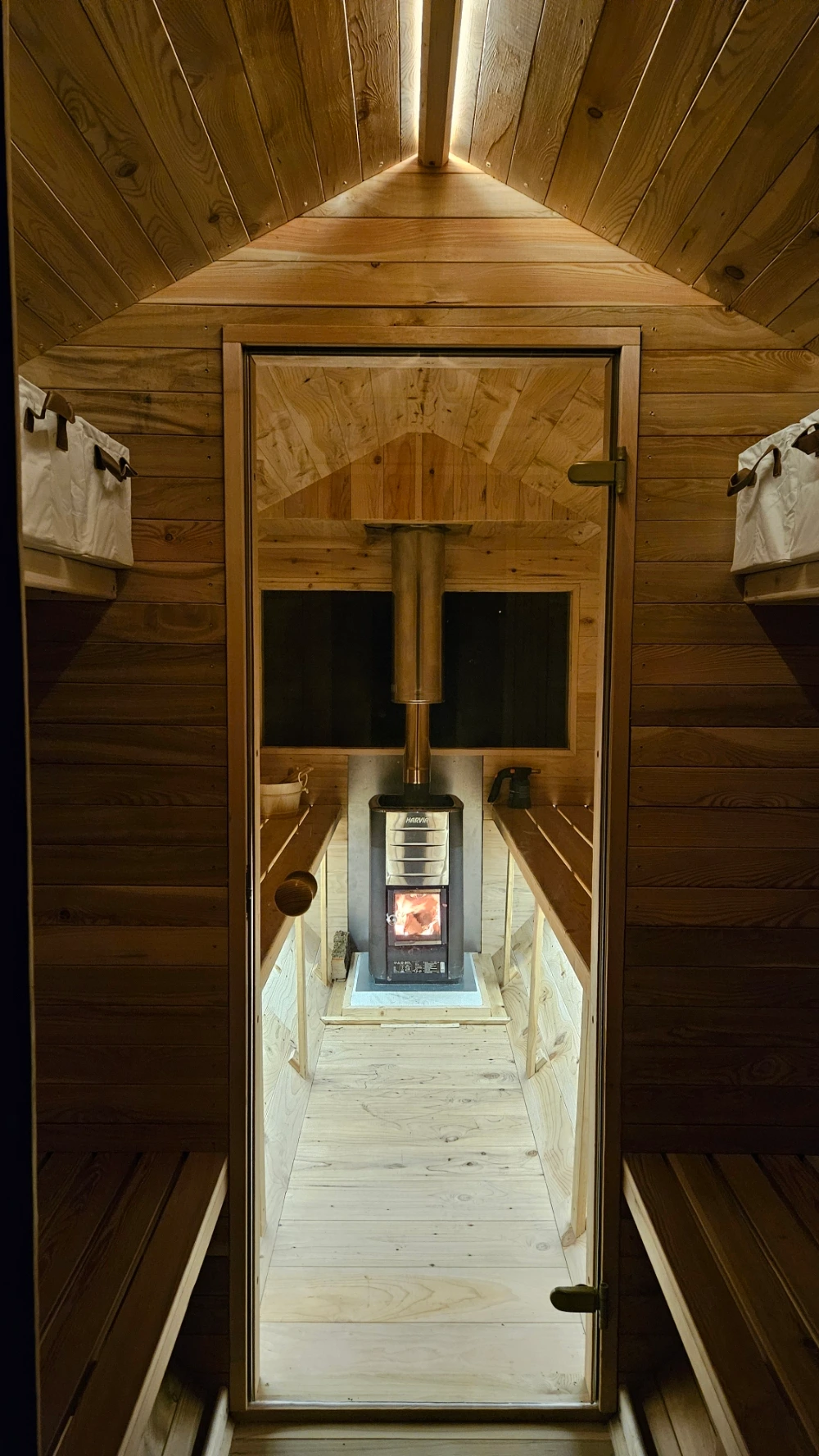 À l’intérieur, un vestiaire chaleureux vous accueille avant d’accéder à la chambre de sauna pour 8 personnes, chauffée au poêle à bois pour une chaleur douce et traditionnelle.